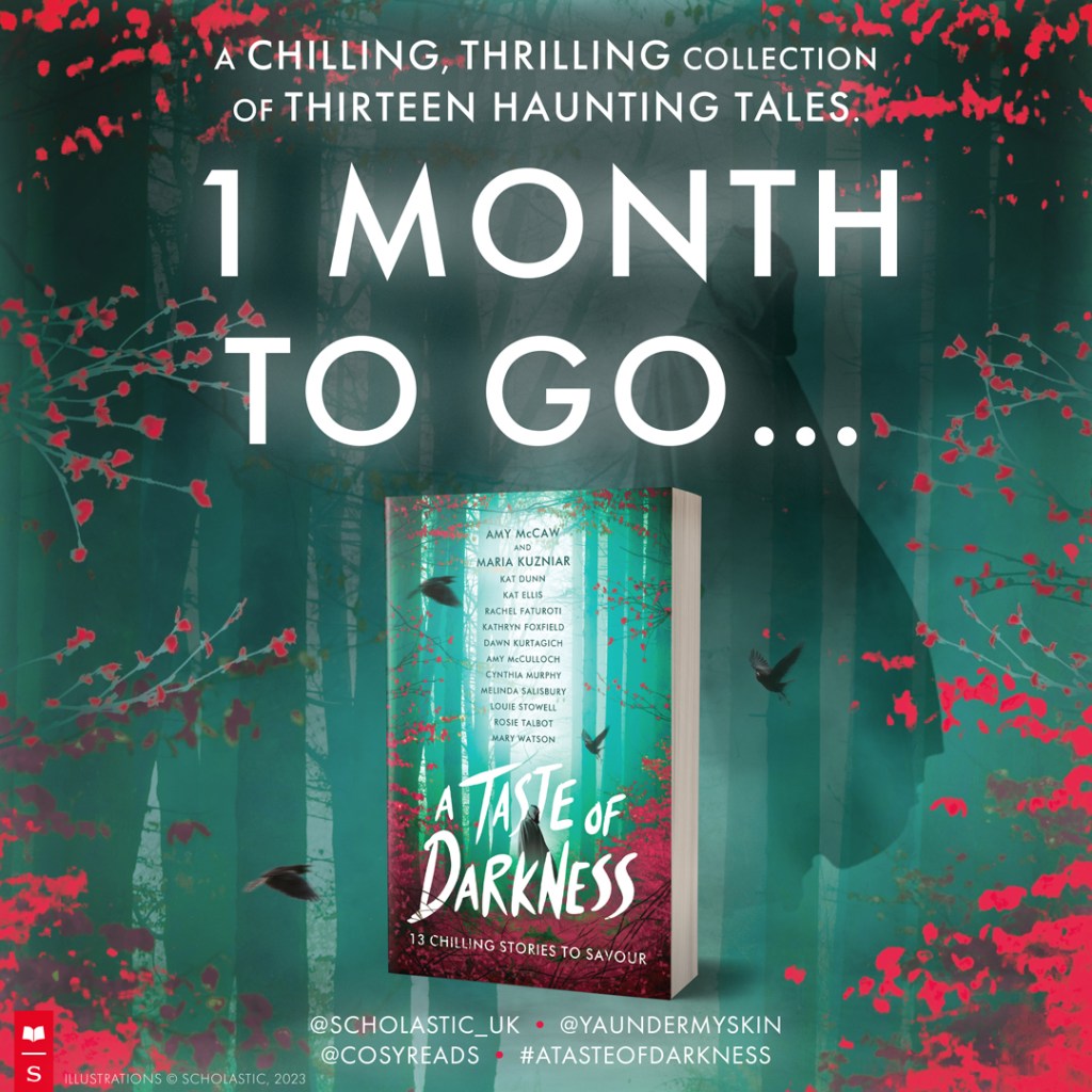 Curated by Amy McCaw and Maria Kuznar, A Taste of Darkness features 13 terrifying tales by UK YA authors including Kat Dunn, Rachel Faturoti, Kathryn Foxfield, Dawn Kurtagich, Amy McCulloch, Cynthia Murphy, Melinda Salisbury, Louie Stowell, Rosie Talbot, Mary Watson and ME!